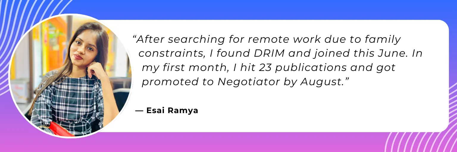I am Ramya from Tamil Nadu, an MBA graduate looking for remote work opportunities due to family constraints. This was when I found DRIM and joined it on June 10, 2024.