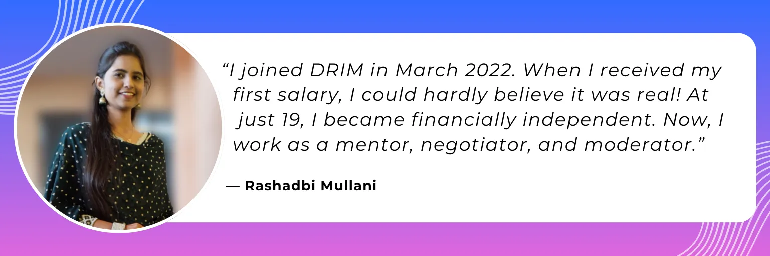 Despite initial challenges that tempted me to quit, I committed fully and am thrilled to be part of DRIM. Being part of DRIM’s success story so soon is surprising and exciting.