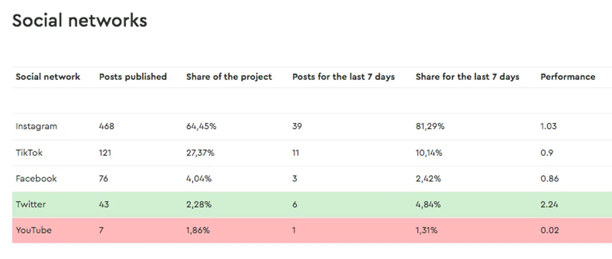 Most of the posts were published on Instagram - almost 500 (64.5%) and it showed good performance - 1.03. The most effective social network was Twitter - 43 posts (2.3%), which showed the highest performance - 2.24.