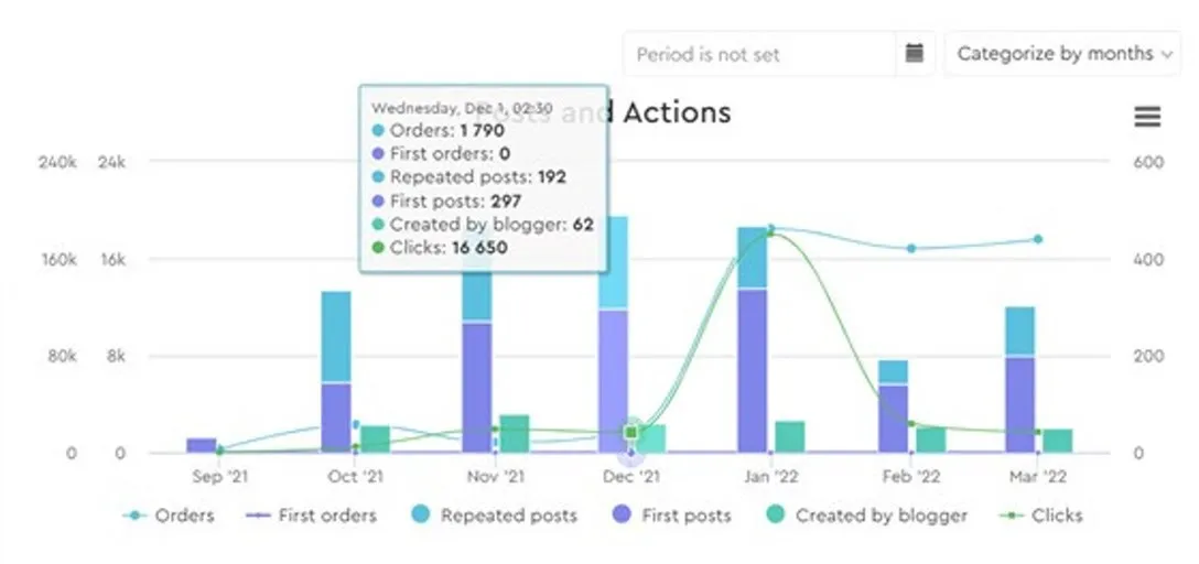 Aumentamos los puntos de contacto con la marca y, con cada contacto, aumentaba la probabilidad de una siguiente compra. Una sola publicación puede seguir generando ingresos para el influencer y la marca incluso 30 días después de la publicación, lo que convierte al modelo CPA en una forma de colaboración tan rentable e interesante. A continuación se ofrece un ejemplo: