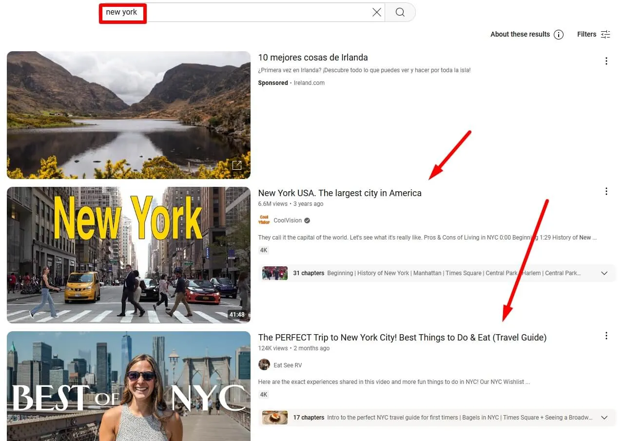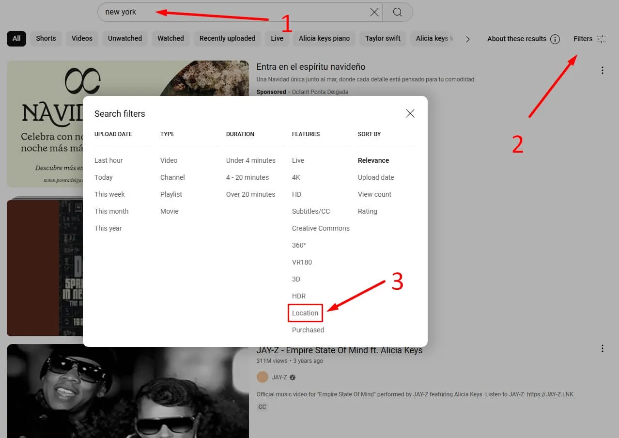 - After selecting the filter, your search results will be refined to display videos relevant to the chosen location. YouTube will discard videos that are not geographical.
